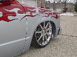 3" body drop, shaved door handles, locks,antenna, wipers, fuel door, tail gate and bumper bolts. custom fabed firewall. custom hood and mirrors. bed to cab walk through. metallic red and silver paint with tribal flame design.