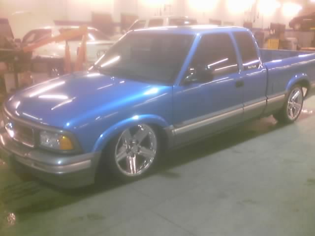 envoy font end,caddy lights,m3 mirrors,shaved tailgait handle,escalade door handles,roll pan,20 inch irocs front 22's in the rear,4 link the rear with a bottle.....
