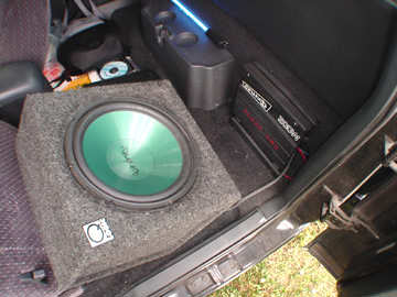 Glowing blue Panasonic AM/FM/CD head unit, 1 12" Infinity Kappa subwoofer powered by Lanzar 800W amp (pictured is a Crunch 200W. the 800 has been shorting out lately). also have Infinity Kappa 5 1/4" in the doors and tweeters located in pods on the windshield posts.