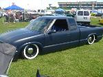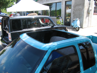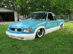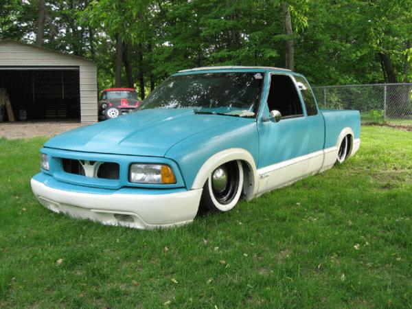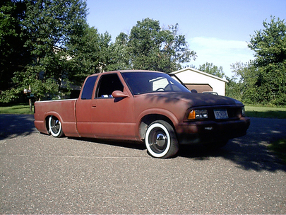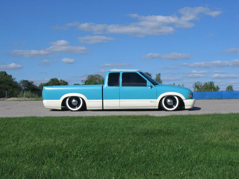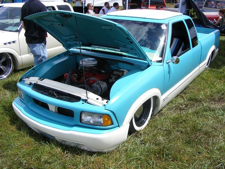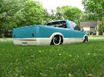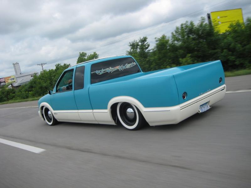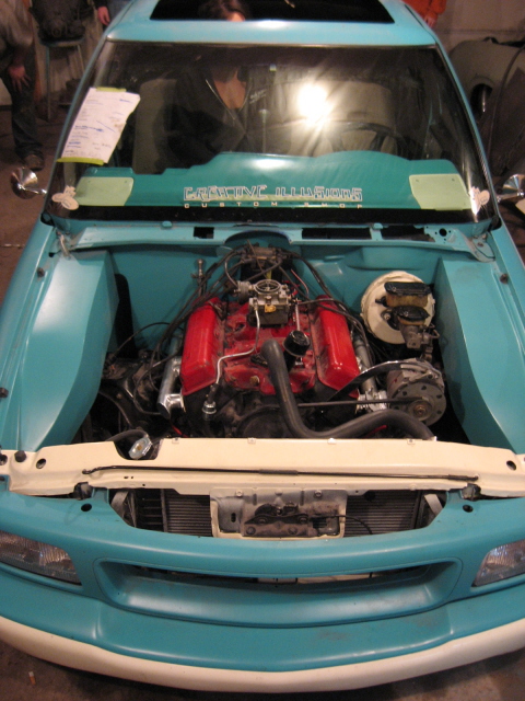 shaved and sealed in hot rod flatz primer/sealer, Uni-tub notch cover in bed, wooden bedfloor and smoothed out bedwalls done by crazytalkcustoms and old skool kustoms and creative illusions, gas filler in bedfloor, big hole in the roof to let the sunshine in and removable fiberglass roof section (tuck n' rolled), shaved everything, 57 mirrors, 1950 pontiac tailights, body dropped at creative illusions, custom grille made from a peterbilt grille