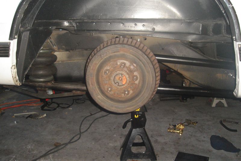 bagged on 4 slam RE7's. engine driven compresor feeding 5 gallon tank and 1/2" air line. custom built rear parellel 4 link with canti attachment.