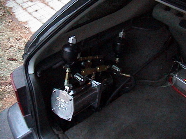 prohopper two pump setup with accumulators for a smooth ride. four optima blue tops in the spare wheelwell. used all parker fitting cause the ones that come in the kits suck.