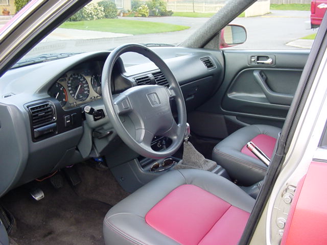 raised tweed flames above the window line, charcoal and red leather seats, changed color of all interior pieces from brown to gray.