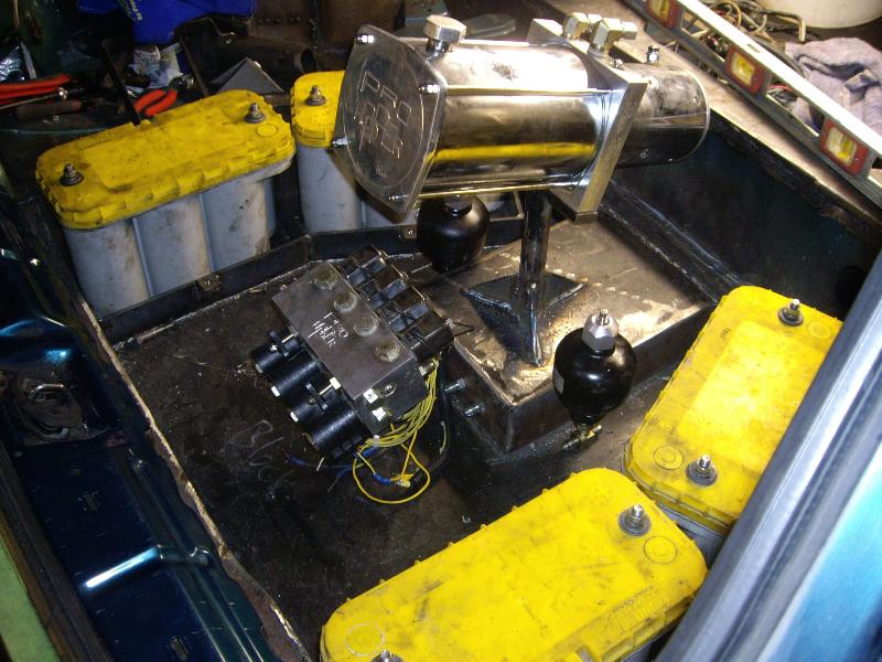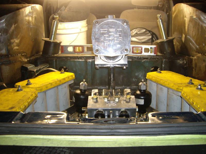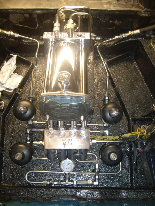1 pump 8 dump pro hopper manifold, 8's in the Front, 12's in the Back with powerballs, 2 link rear arms made out of 1 3/4inch .250 wall DOM with 7/8 heims, 1/2 inch plate rear cradle Accumulators for a smooth ride, Parker fittings, Hardlined, 4 Optima D31A yellow top Batteries sunken in the the spare tire holder, Polished DC front strut bar, rear is tubed for 22's