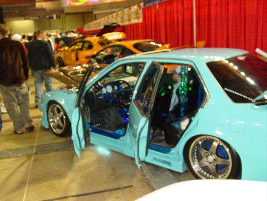 fully molded black widow rear and side skirts..buddy club front. R1 racing wing,F1 fiberglass fenders lambo doors,molded behind plexi glass tv in rear panel of car, custom license plate on motor frame, fresh baby sky blue paint. Euro R japan tail lights. 1pc jdm blk projection head lamps ..full euroeffects 7 color changing led under car kit ViS Carbon Fiber Extream GT Hood Fiber Images custom carbon fiber trunk