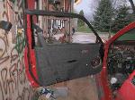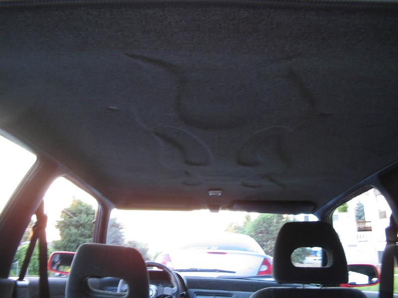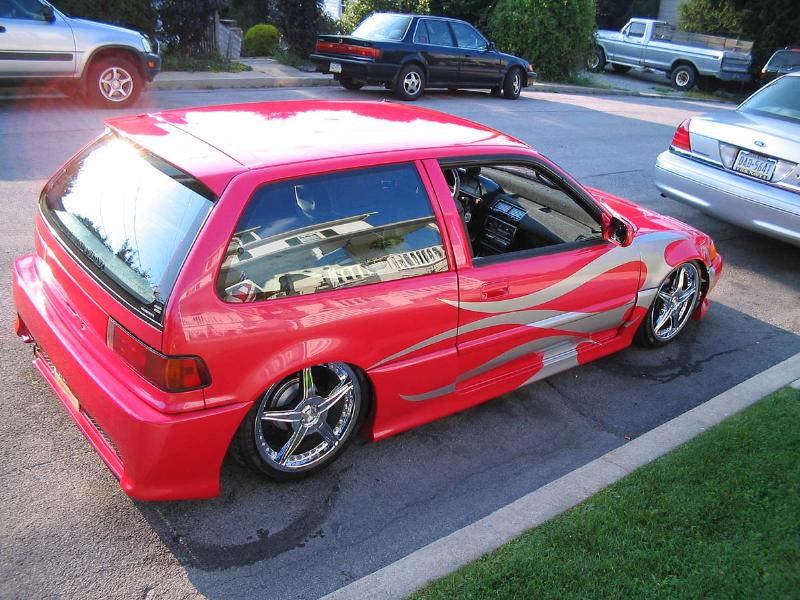 tweeded everything with dark and light gray, integra ls seats and center console with armrest, ichibahn pedals and floor plates, flamed tweed roof liner, billet shift knob and a monkey skull shift knob, custom rear half made to hold soundsystem and air ride components, hand pinstripped gauge cluster hood and rear hatch cover, billet moon eyes maltese cross mirror with shrunken head, raised "666" dice on rear cover behind seats