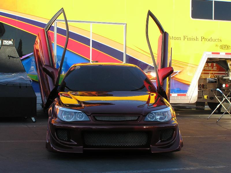 DuPont Hot Hues Sinful Cinnamon and DuPont Hot Hues Crimson Splash, Shaved door handles, hood squirters, antenna, emblems and plate box, Paint and body done at Ten Ten Custom Paint (702-614-9040), 2004 BMW 5 Series Headlights, Lexus RX 330 Taillights, VIS Battle Z front bumper, VIS TSC side skirts, VIS TSC Rear Bumper, conversion done at Auto Explosion in Gardena L.A. (310-329-6691), Decah door kit(3-15-03) and a billet lisence plate holder from F.B.I.