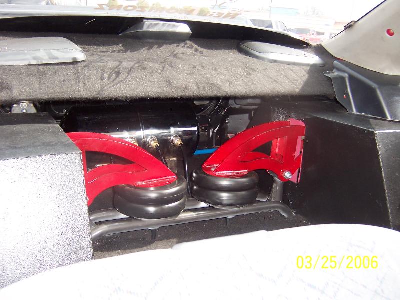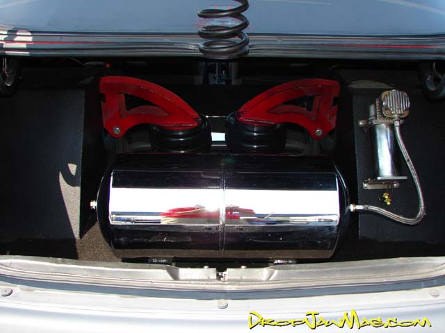 Cans with in front and cantilever setup in rear with slam specialties re 8 tubbed in rear to lay all the way and cut the strut towers in front to lower 3 inches 6 gallon tank with all smc 3/8 valves.