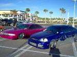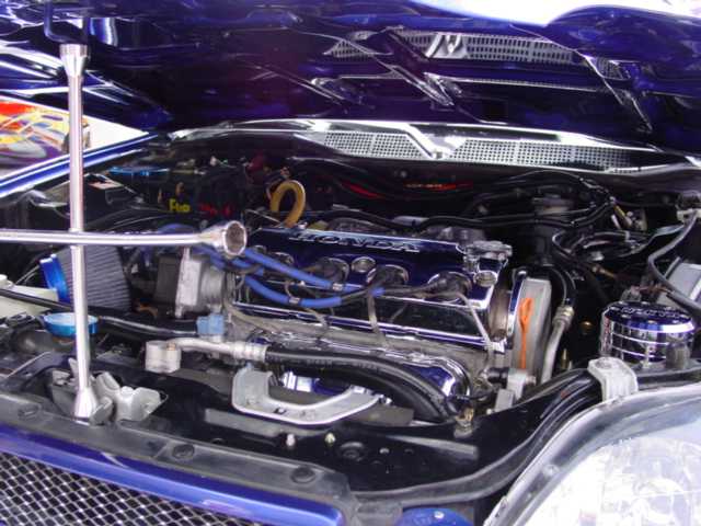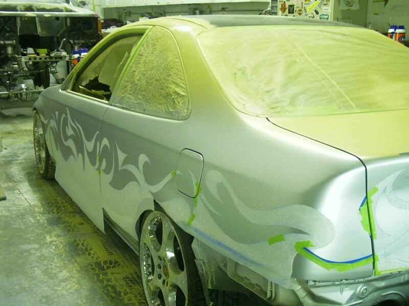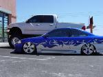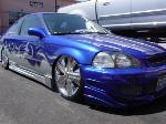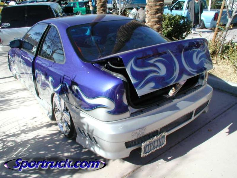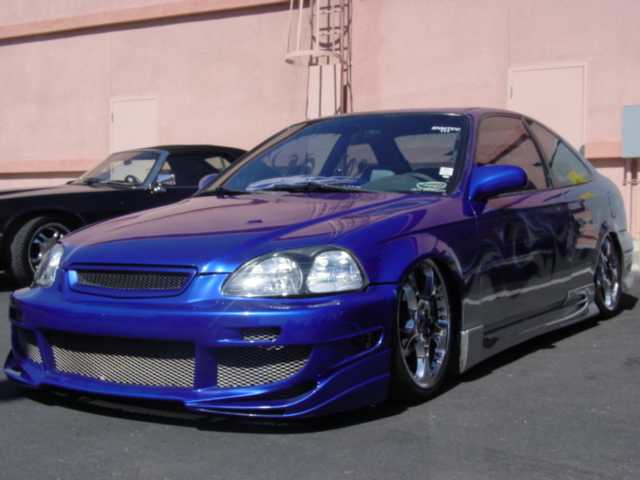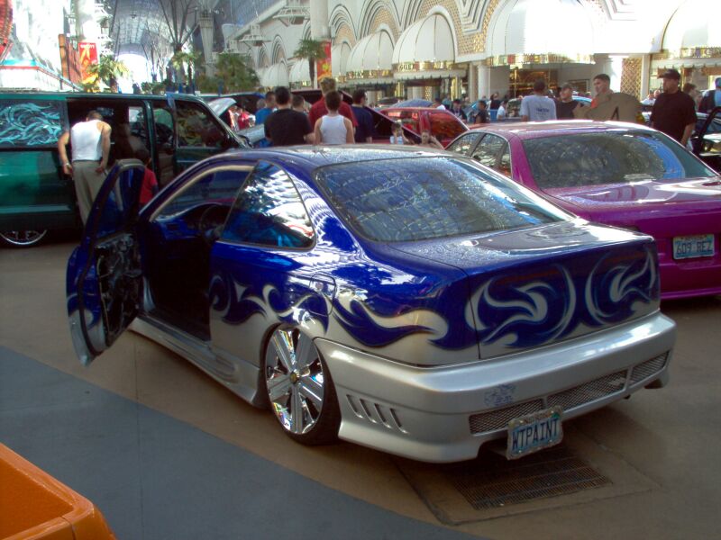 The Top half is HOK Makic Blue Pearl. and the bottom is a HOK Silver metalic something. All highlighted and shadowed through the Jams and Striped tribal style in Baby Blue. All so, shaved everything but the gas door. 2- 12" by 1/4" Hi-tech LED's for brakes. Body kit, JDM front lights. etc. All painting and Finish work Done By TENTEN CUSTOM PAINT of Las vegas