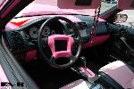 factory interior was tan but is now pink and black leather and vinyl with "Pinky" stitched into headrests and dash painted to match exterior