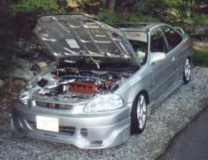 TD04H-15G Greddy Turbo Kit Greddy Front Mount Intercooler Greddy TypeS Blowoff Valve AEM Cam Gear AEM Fuel Rail AEM Pressure Regulator RC Engineering 310cc Injectors GUDE Turbo Cam (92-95 Civic) Ported & Polished Head Port match Intake Manifold 3angle Valve Job JE 9:1 Pistons Crower Connecting Rods STR Blockguard ClutchMasters Stage3 Clutch Random Technology High Flow Cat. Tanabe Racing Medallion Exhaust Polished Valve Cover Polished Distributor OBX Breather