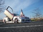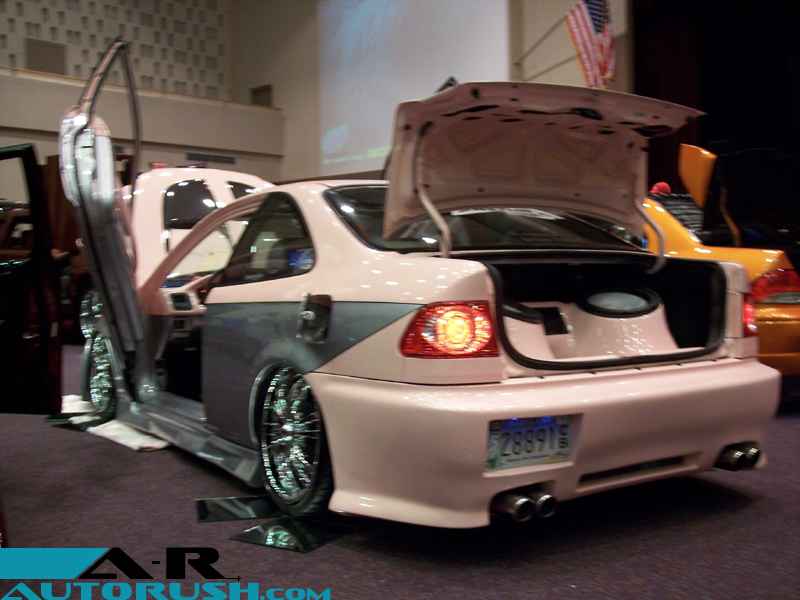 full body kit .. bullet fenders .. m3 mirrors .. duel halo projector headlights .. different tail lights ... custom painted carbon fiber hood ... duel exhaust .. shaved door handles ... shaved side moldings ... shaved trunk ... tag relocated on drivers side in rear bumper ... shaved ant. ... two tone paint job which is baby pink and sliver w-a black pin stripe which flows from the outside to the inside