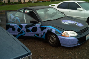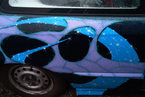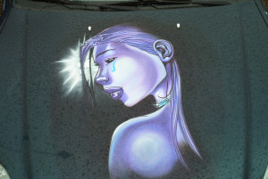 all air brushed with picture of girl. Also not pictured blitz front with spider man sides and rear, airbrushed on hood. I Had shaved tails into bumper but got pulled over so he put them back. Shaved trunk, doors.