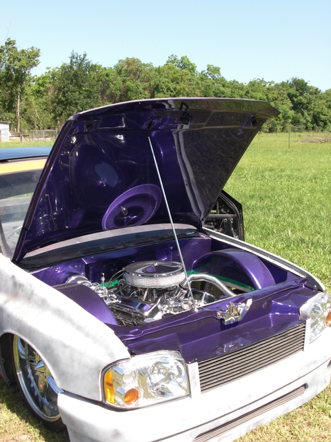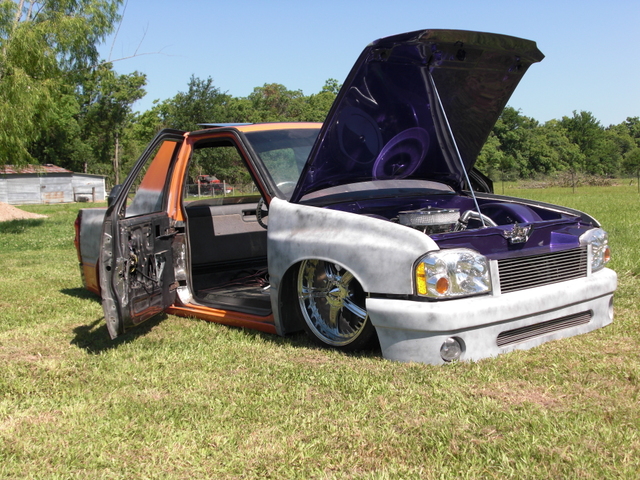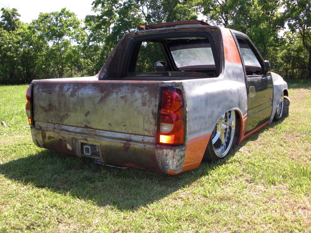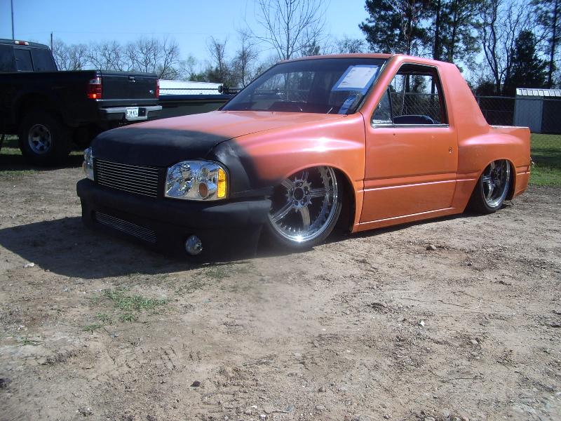 03 Frontier head lights, one off billet grill, one off bumper, raised fenders for 22s, suicide doors, full skind in back, 07 Chev tail lights (might be changing that), shaved doors, gas door, pinch welds around rear, 95 Toyota 4runner rear roll down window, smoothed bed, smoothed under side of hood, sun roof