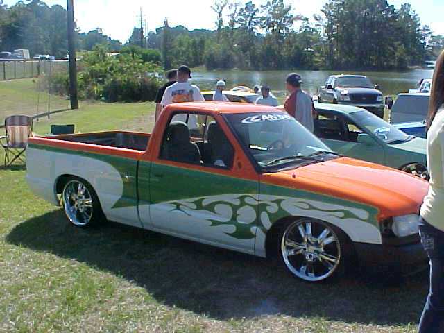 shaved,taillights,cal skin combo,10'' led's,Painted Hok Tangelo Pearl hok white with red ad orange pearl,kandy limetime calidesign and tribals,yellow camel hair and fine-line pinstriped SOLD