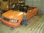 shaved,door handles,tailgate,antenna,hood pissers,tail lights,working on being a convertable right now a roadster,rollpan with tail lights primered orange (spectra prime) killer stuff
