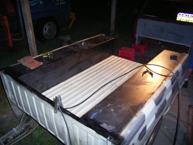 shaved bed, inc. fuel door, tie downs and the top of the tail lights, will have custom bed floor, and a combo skin, with nuber plate in the center, cab is now in primer ready for paint
