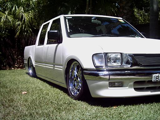 Shaved door handles , blinkers , whole tray , ariel. Welded shut tailgate , all lights are euros.