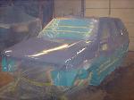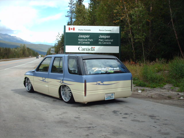 Amigo front end swap. Shaved corners(These fuckers were a night mare. We got 9 Hours into each side just in metal work. As little filler as possible. Thanx Jeff from "JRS Customs", couldnt have done it with out you!), antenna. hood squirters, and emblems. Ford Ranger headlights with a Trenz Toyota Phantom billet (cut down). One off/one pieced front bumper. Shaved the taillights, lower rear rocker corners, spare tire mounting holes, and handles. It has full one-off rear skin combo(thanx Mother Goose Customs) and caddy's with a plate box. Shaved mirrors(replaced with chrome Buell motorcycle mirrors), third brake light, lightbar mounts, and roof rack. 66" x 36" StreetBeat rag. Every thing is primed with custom mixed Sherwin Williams "Passion Purple" and "Mello Yellow" with a cool graphic breaking it up.....Thanks again Jeff at JRS Kustoms.