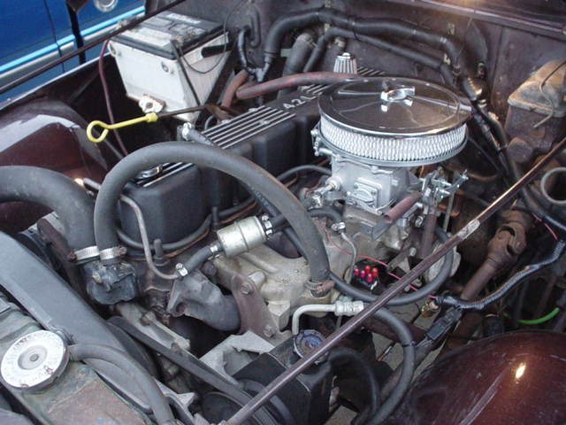 258ci I-6, 4-speed, MC2100 carb, aluminum finned valve cover, and hedman header into purple hornie.