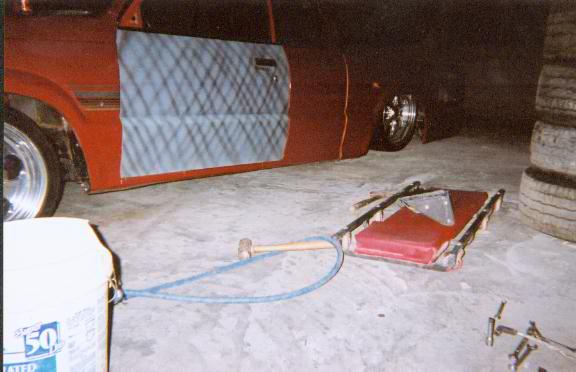2" drop spindels.bagged on all 4's 4 linked rear..new rear clip from cab back.keep the bed un-cut..3" b/d..1/4" firestone old school set-up with 1 comp and 7 gallon tank,dual paddle's..lol