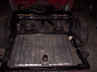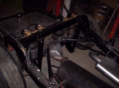 Bagged, 4 linked, Rear mount bagmounts. Engine driven compressor (factory A/C converted), No limit Customs Billet Hubs, redrilled 5 bolt axles