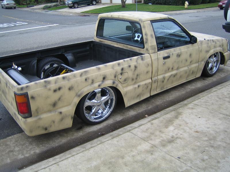 calicombo, one-off 4runner front bumper widened to the mazda to fit the fenders and everything(SOLID METAL), trenz grill, white blinkers, frenched plate, flared bed.