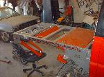 Smoothed and painted dash, Custom center console covered in red & gray tweed. And Mazda MX-3 buckets with headrest removed and filled in, covered in red and gray tweed.