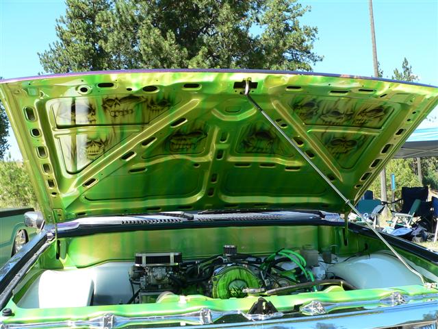 Front frame shaved and painted. Stock rebuilt bored .30 over, weber 38/38, mild cam, pacesetter ceramic coated headers, flex-a-lite electric fan, all parts painted, and polished. Tubbed, shaved and painted. Thanks to Steve at Nevets Kustoms