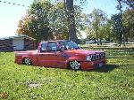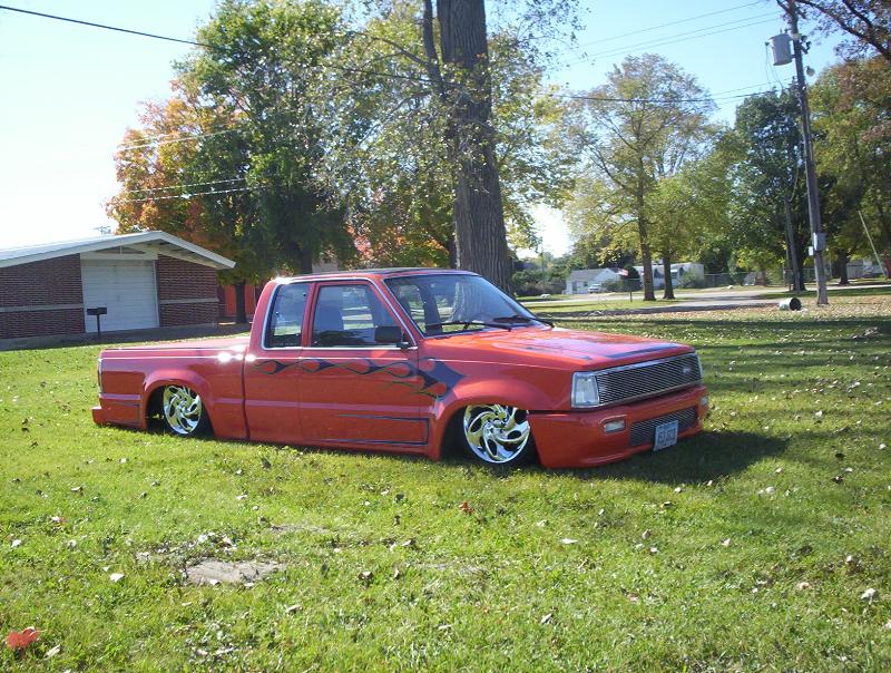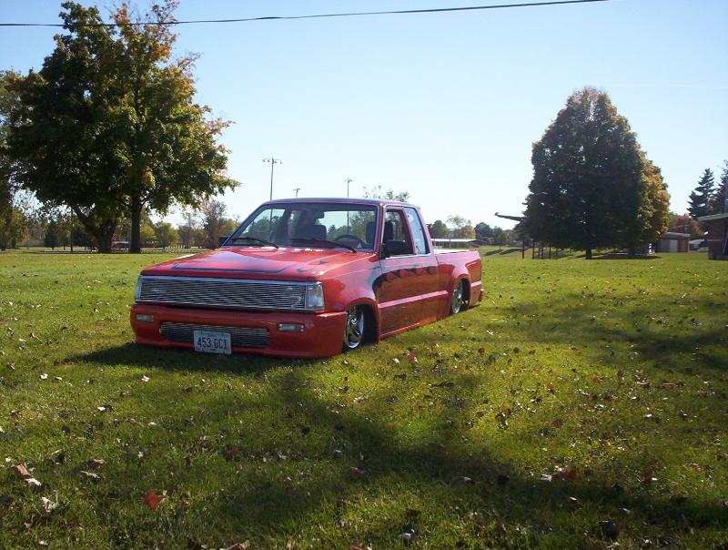 bdy drpd 2 1/2, shaved entenna,door handles,emblems,box seams.split and molded rear bumper to box.toyota chrome front bumper welded together and lengthend on sides .skirted front wheelwells on 4x4 sheet metal.custom mix candy orange and candy purple old school paint job.all work done by myself at MIDWEST CUSTOMS 319-551-0818