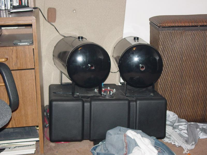 bagged 2500 front sleeve bags in the rear, 4 link, 2 5 gallon tanks, viair 500 compressor, 1/4 lines and manual valves