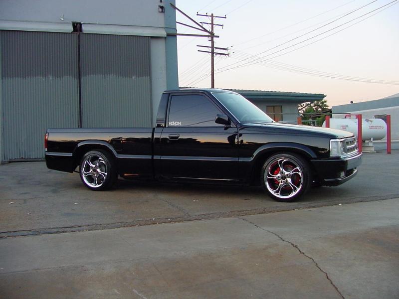 The truck was block and the emblems were shaved off. The paint is from DuPont and the color is Pitch Black. Body work and paint job was done by Angel's Auto Body in Huntington Park, California. For lights it has H4 conversions with PIAA's super plasmas HID and APC clear corners and bumper lights. Front clip is stock but chrome.