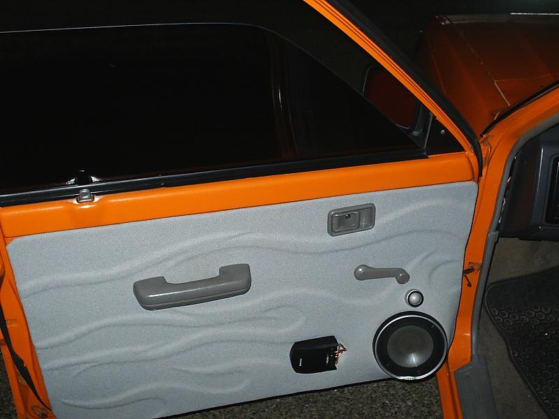 Gray tweed with orange stitching, fiberglassed center console, doors and hopefully i can do the dash