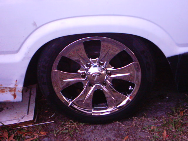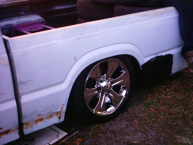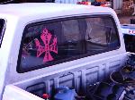 Light Gray Primer, with spray painted Pink flames on the driver side. Shaved Tailgate. Toyota 4-Runner Bumper. Full Billet Grill.