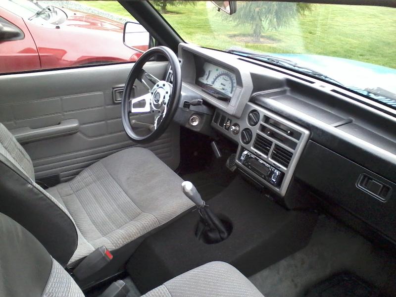 chrome GT steering wheel, re-painted dash and panels, replaced seats and carpet from red to grey, custom center console, white faced gauges with blue LED bulbs, under the dash LED's, aftermarket pedals