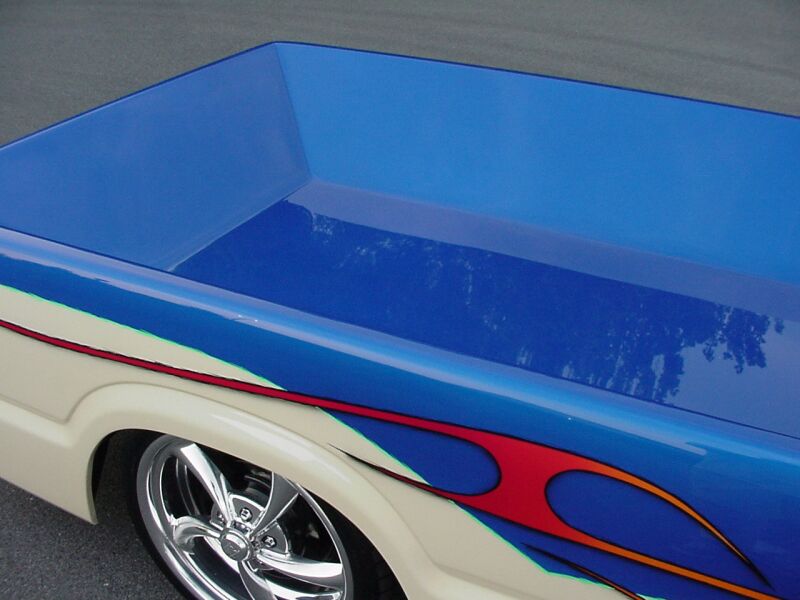 Shaved body line, tailgate, tailights, door handles, cowl, gas door, bed has been smoothed out. HOK Truble & PPG cream using Sunrise, Sunset, & Magenta pearl conclude the paint scheme
