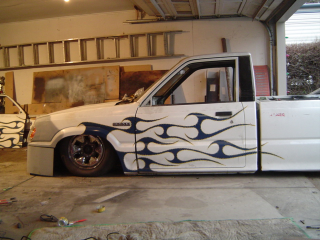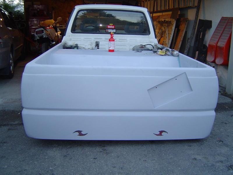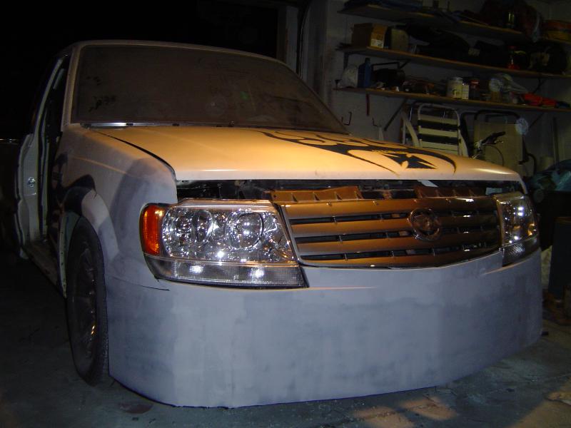 shaved tailgate handle, tail lights, welded tailgate shut, custom tail lights, molded roll pan, full sheet metel bed, frenched plate on angle. 3 inch body drop, full custom front end. 04 Jeep grand cherokee headlights, 04 caddy cts grill, custom fabbed bumper and rad support. full sheet metal firewall and wheel tubs. all work done in my driveway, with my grandpas stick welder and an angle grinder.
