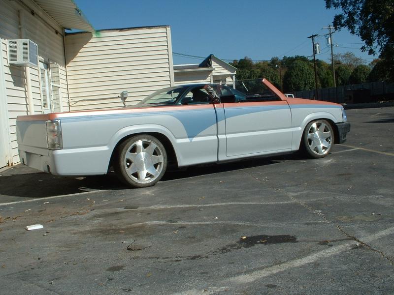 Shaved doors, fenders, antenna, windows, no roof, lexan window, capped pillars, clear lights all around, bed body lines....