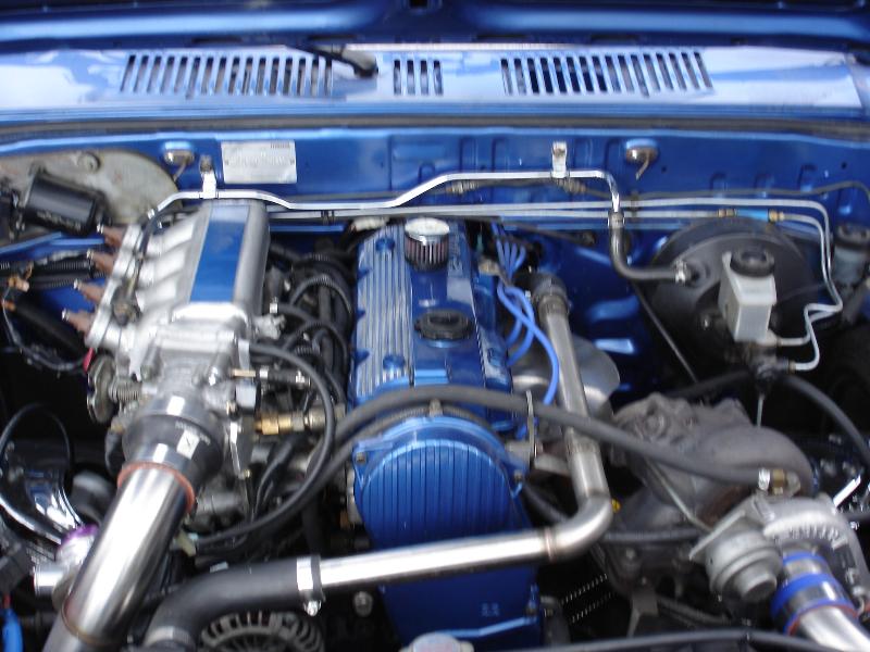F2T motor: Forged arias pistons, overbored throttle body, Port and polished intake and exhaust mainfolds, Modified intake for RWD, 4 additional injector bosses welded to the intake plenum, 330cc injectors, dual friction center force clutch, holley 255 inline fuel pump, Microtech stand alone fuel managment system, greddy type s BOV, fuel surge tank, RCI fuel cell, 2.5" mandrel bent exhaust, electric fan, all custom stainless intercooler and piping, ht18S RX7 turbo, manual boost controler, 100amp rx7 alternator.