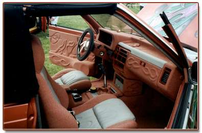 Tweed and leather. Fiero seats. Custom door panels w/speaker pods