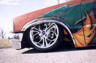 BD 2 3/4" Convertible. Toy bumper and valance. Clears all around. Mirror rear window (no it's not tint!). Burnt orange paint w/wild 22 color flames/tribal graphics