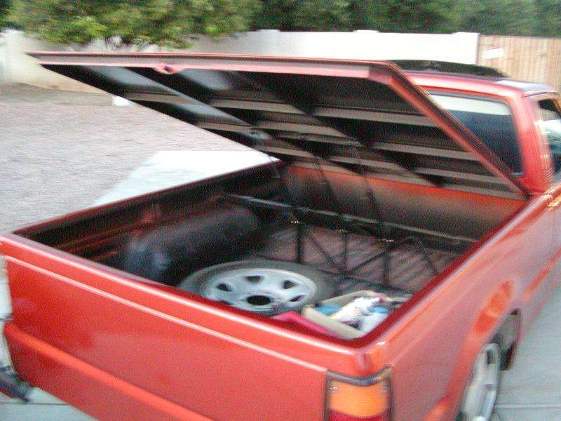 Dodge Neon Burnt Orange with Prowler pearls added. Shaved handles, corner lights, rollpan, tailgate welded shut, Sunroof, 1/8" Steel bedcover, 4x4 fenders and bed. Paint will stay like this till truck is done and then get full color change with graphics. Audi headlights with a custom grill. Chrome license plate bracket.