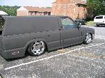 flat black primer, 17" escalade wheels, cadillac taillights, 2003 cadillac license plate holder and reverse light set up, 1968 cadillac rear side markers toyota chrome front bumper and lower valance, shaved handles, tailgate, and wiper cowl