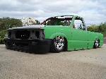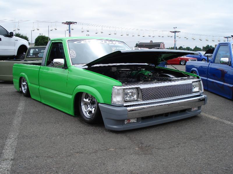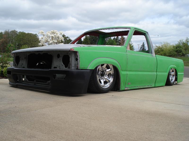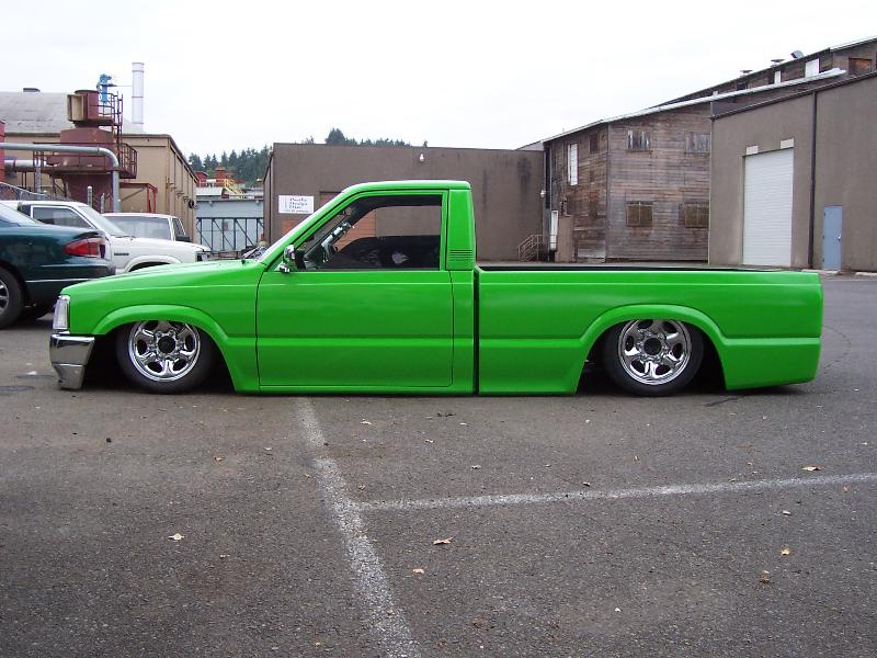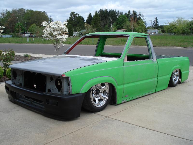Body-dropped 3-inches / shaved handles, emblems, key locks, antenna, rain gutters, gas door, taillights, tailgate, b-pillars, wiper cowl, front corners, mirrors and body seams / door sills / FBI tailgate/roll pan skin combo with 10-inch flush mount LED taillights / Grant Kustoms weld on pillar shavers / Grant Kustoms one piece Toyota 4x4 bumper made to match the fenders / custom inner fender wells in engine compartment / fully shaved firewall - relocated brake booster behind dash / B2600I hood / relocated gas door in bed / took out all bedliner so the bed can be painted.
