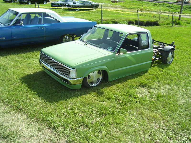 Shaved doors, antenna, cowel, tailgate, emblems, fuel door. toyota 2w front end and billet mazda grille, stock-floored 2 inches to pinch mold, motor dropped 1/2 inch, relocated gastank