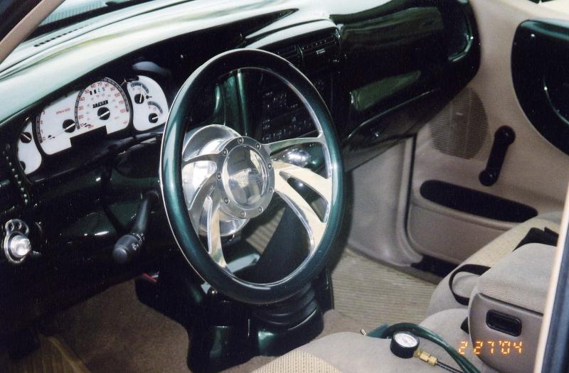 Dash smoothed and painted with airbrushed condor on passenger side, Billet air nobs, air bag cover, head light bezel, rear view mirror, painted parts to match exterior, white face gauges, 2- autometer air pressure gauges, gauge pod painted to match interior