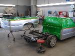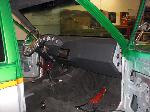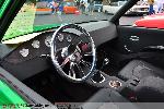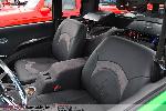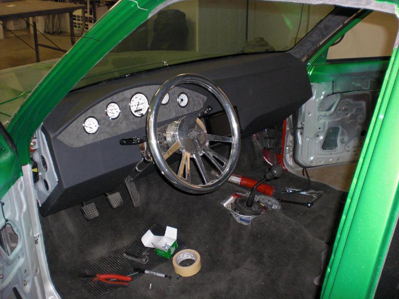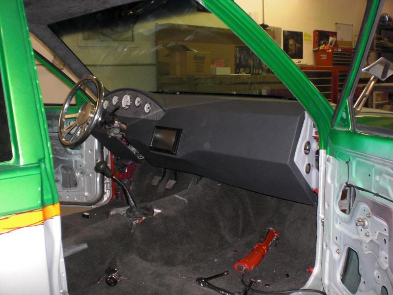 Hot rod style with charcoal vinyl and suede - 1 off sheet metal dash wrapped in vinyl and gauges are mounted in bezel wrapped in suede. JVC double din in dash. Custom - door panels, center console, kick panels (by Sosa), headliner, sub box w/ 4-10" Kenwood subs and 2 kenwood amps floating over subs