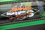 All House of Kolor- two tone pearl lime time green on top, pearl silver/white on bottom w/ sunset orange stripe and red slash pin striping on both sides...