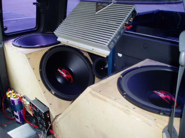 clarion tv head unit, dvd/cd/mp3 player, kenwood componet system, MTX crossover, 2 1 far. caps, Kenwood ps400m mono amp, 4 15" Fosgate subs.