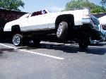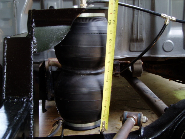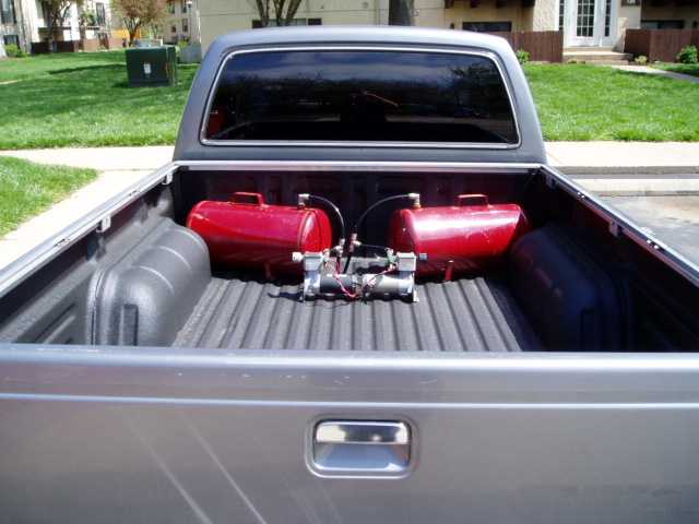 full air ride. 2 M.I.C. 1/2" mass-flow valves, 2 M.I.C. white face gauges, 1/2" air line, 2 compressors, 2 5 gal. tanks, 4 2500 bags, reverse triangulated four link, 6" monster notch. front/back right now.